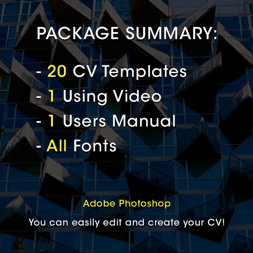 By purchasing this 20 CV Templates, you will receive all of our "20 CV Templates" updates for free, forever.
